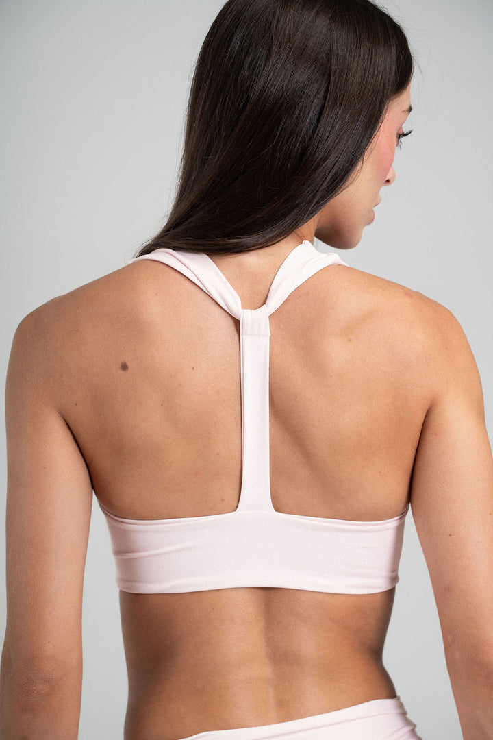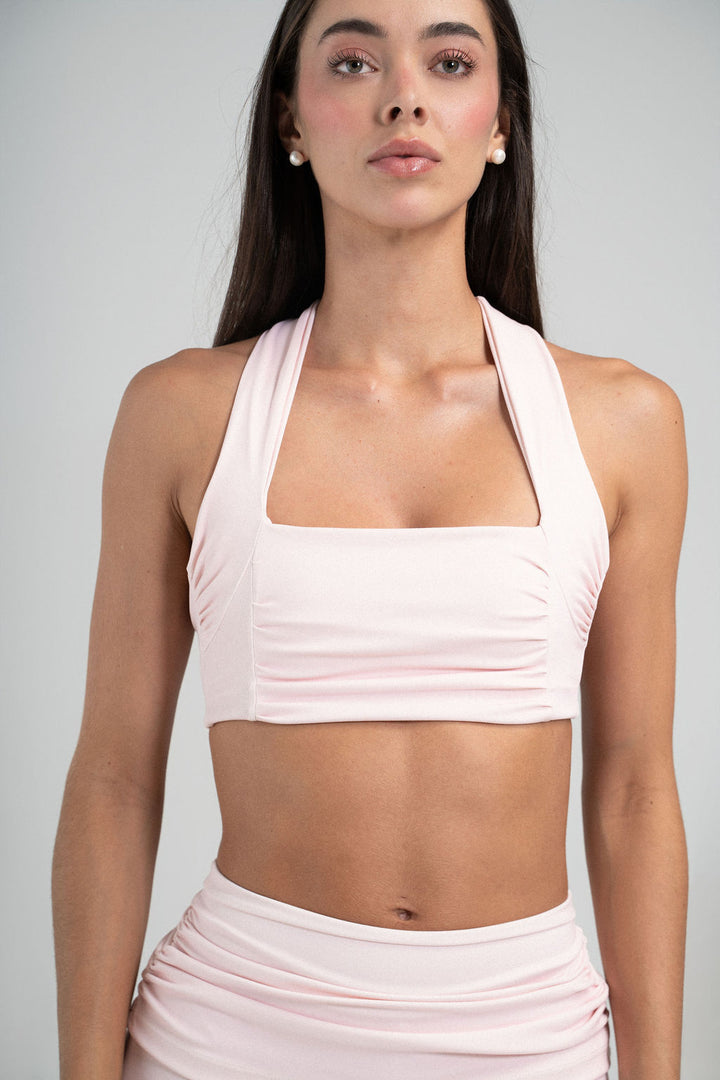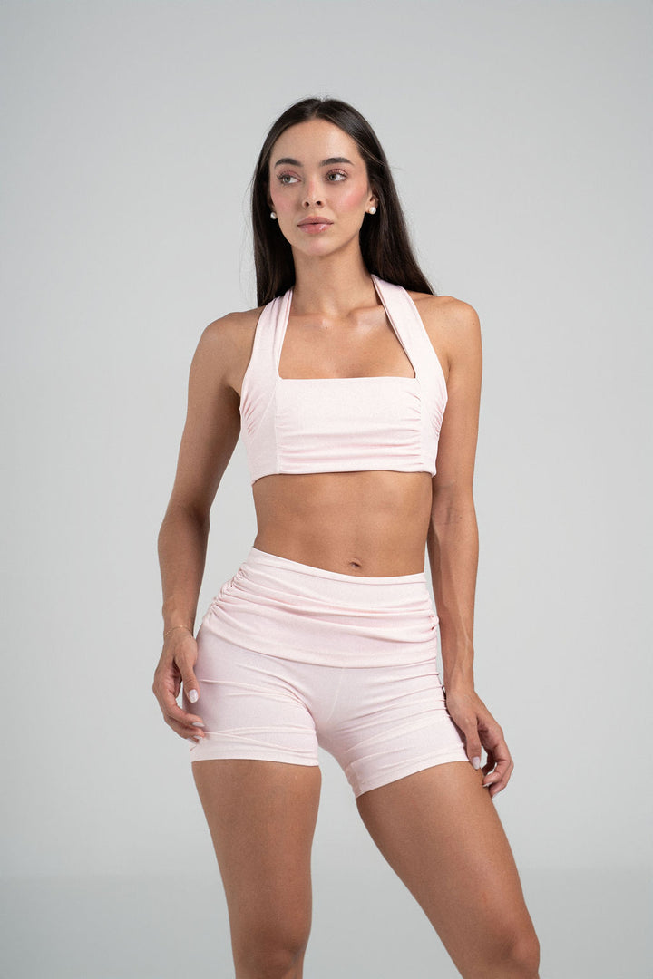Su drapeado lateral estiliza y aporta un detalle moderno, mientras la banda bajo el busto asegura firmeza y comodidad. El diseño tipo halter con refuerzo en la espalda distribuye el soporte de forma equilibrada, evitando que todo el peso recaiga en el cuello.